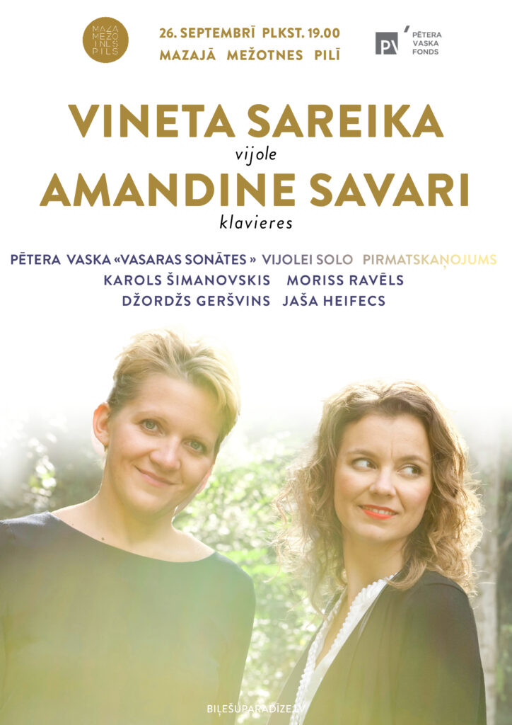26.septembra koncertā izcilā latviešu vijolniece Vineta Sareika pirmo reizi atskaņos Pētera Vaska “Vasaras sonāti” vijolei solo, savukārt kopā ar talantīgo franču pianisti Amandīni Savarī mākslinieces atskaņos Karola Šimanovska ciklu “Trīs mīti vijolei un klavierēm, op. 30”: “Aretūzas strūklaka”, “Narciss” un “Driādas un Pāns”, Pētera Vaska Vasaras sonāti vijolei solo, Morisa Ravēla Sonāti vijolei un klavierēm nr.2, kā arī Džordža Geršvina / Jašas Heifeca Transkripcijas no operas “Porgijs un Besa”. Koncerta sākums – plkst.19.