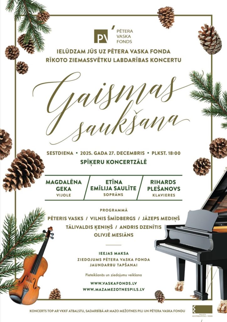 Ziedojums Pētera Vaska fonda jaundarbu tapšanai. Kā ierasts, arī šogad laikā starp Ziemassvētkiem un Jauno gadu – 27.decembrī – Spīķeru koncertzālē izskanēs Pētera Vaska fonda rīkotais tradicionālais Ziemassvētku labdarības koncerts “Gaismas saukšana”. Koncerta sākums – plkst.18. Koncertā, kurš notiks jau vienpadsmito reizi, piedalīsies jaunā operdziedātāja Etīna Emīlija Saulīte (soprāns), vijolniece Magdalēna Geka un pianists Rihards Plešanovs, un tajā iegūtie līdzekļi tiks ziedoti jaundarbu pasūtinājumiem un latviešu kamermūzikas turpmākajai attīstībai. Šajā vakarā viesmīlīgajā Spīķeru koncertzālē izskanēs Pētera Vaska skaņdarba “Castillo Interior” versijā klavierēm solo Latvijas pirmatskaņojums, Andra Dzenīša “Trīs Knuta Skujenieka dzejoļi”, Tālivalža Ķeniņa Divas solodziesmas soprānam un klavierēm un 1.sonāte vijolei un klavierēm, Olivjē Mesiāna “Tēma un variācijas” vijolei […] Lasīt vairāk